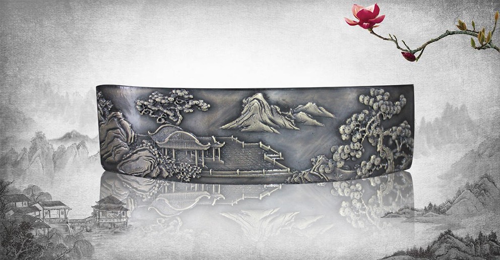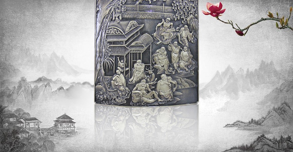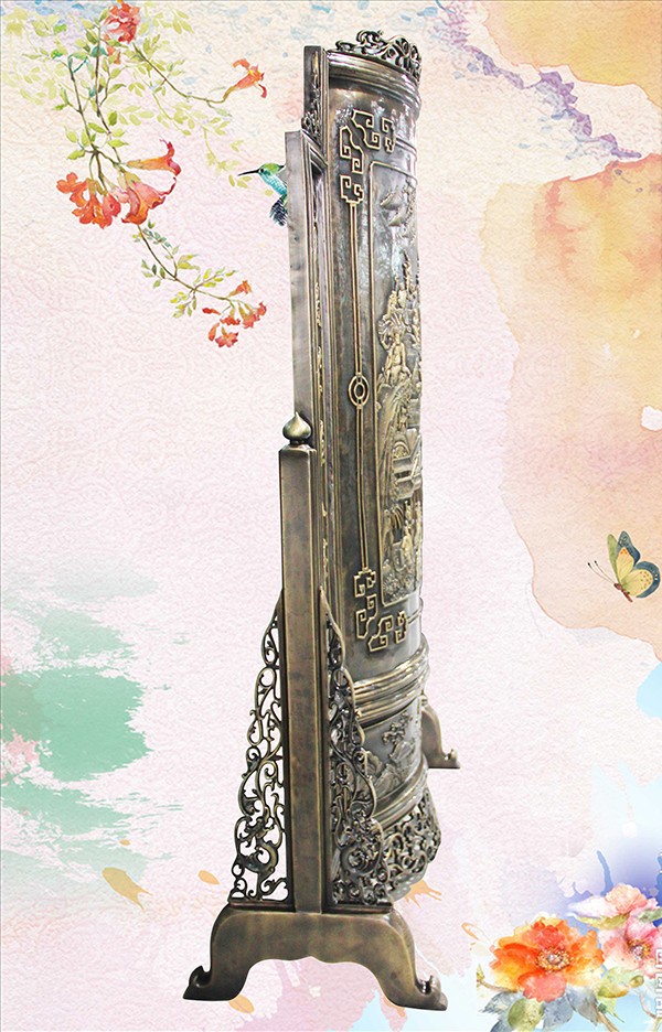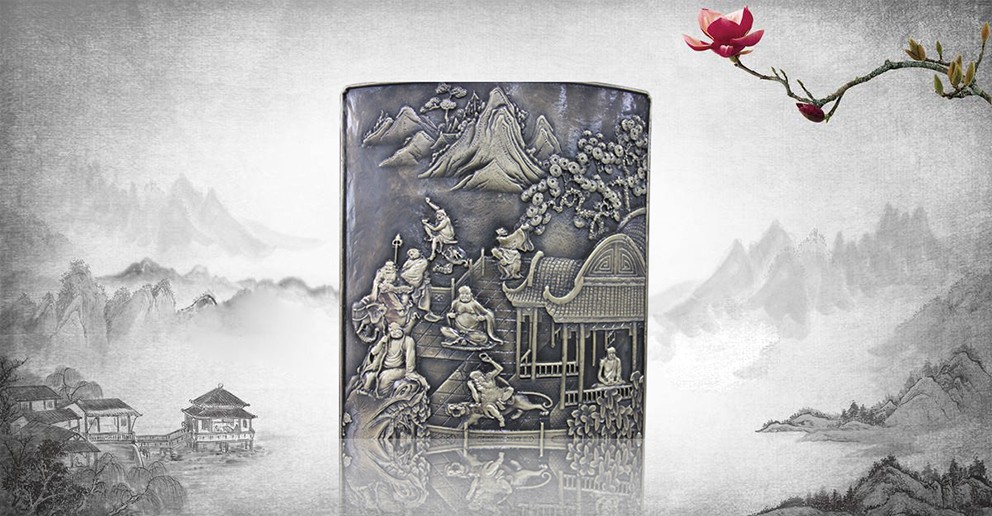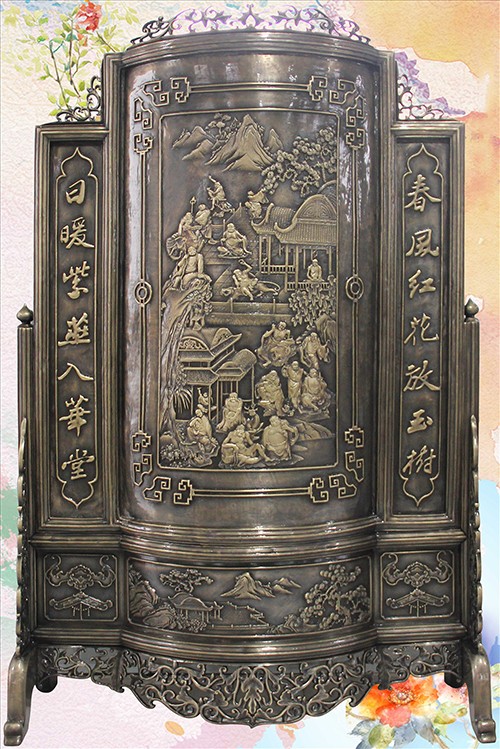 此幅青銅鑄造的《十八羅漢插屏》,是從一友人收藏的大約清中期紅木插屏上翻模制成的。整體上看玲瓏天成,布局精巧。從工藝上看雕法嫻熟,匠心獨(dú)具。特別是十八羅漢,個(gè)個(gè)活靈活現(xiàn)、栩栩如生。作者通過(guò)板塊錯(cuò)落的布局,使畫面生動(dòng)起來(lái),產(chǎn)生了上乘的視覺效果。