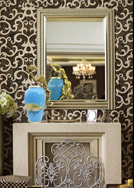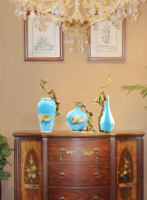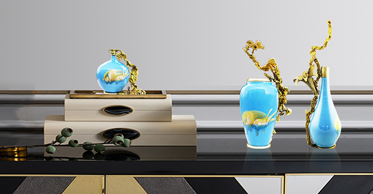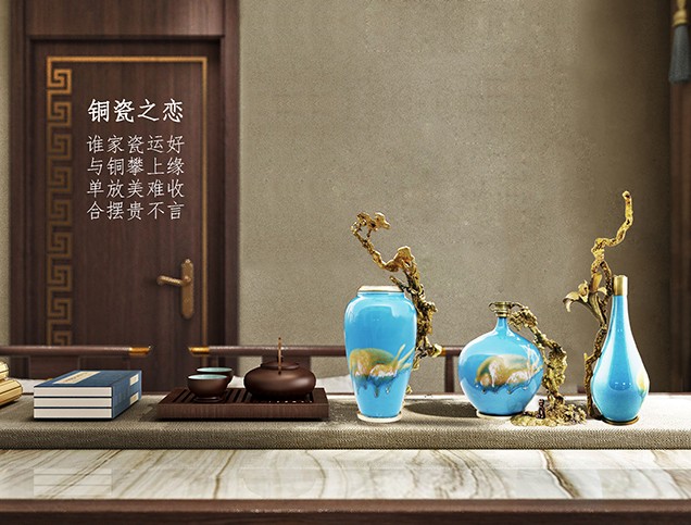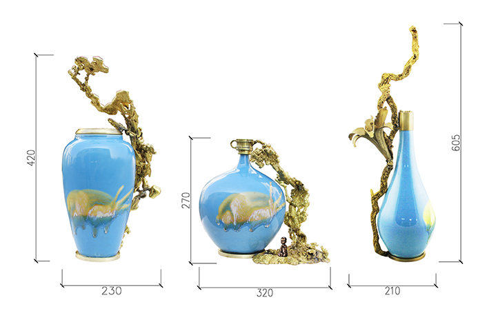 首先給彩瓷加了一個銅底座、銅沿口,然后把熔化后的銅水倒進沙里,形成不同自然形狀后再與彩瓷底座和沿口相連,效果出人意料的好,厚重與輕脆相融,古樸與現(xiàn)代結合,也不知是瓷攀上了銅,還是銅纏上了瓷。相得益彰,妙不可言。